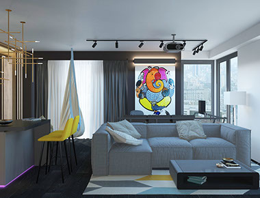 Projekt byl připraven pro úspěšného mladého muže, který miluje neobvyklá technologická řešení, pohodlný nábytek a pestré barvy. Zvláštním požadavkem klienta bylo vytvořit prostor tak, aby se ho dalo transformovat, a to nejen změnou umístění objektů, ale i spojením nových přístrojů, zavěšením nových lamp a nastavením osvětlení.