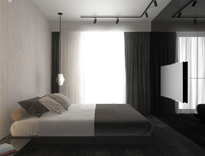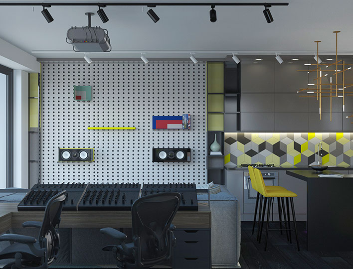 Проект был подготовлен для молодого успешного мужчины, любящего необычные технологичные решения, удобную мебель и яркие цвета. Особой просьбой клиента было сделать пространство таким, чтобы в случае чего его можно было трансформировать, при этом не только меняя расположение предметов, но подключая новые гаджеты, вешая новые лампы и регулируя освещение.