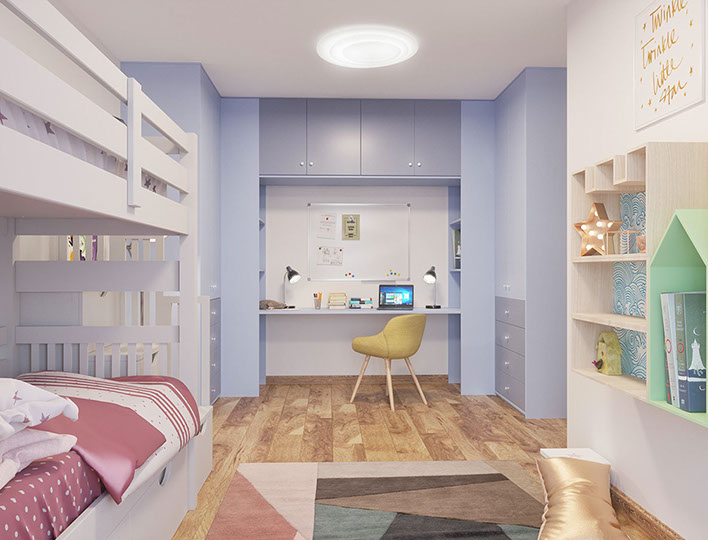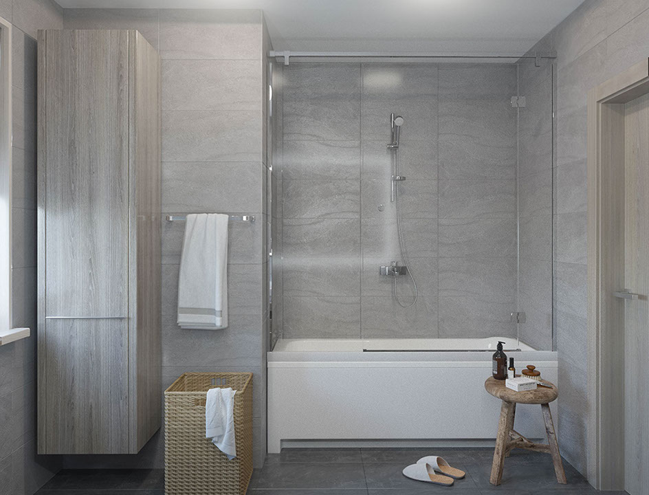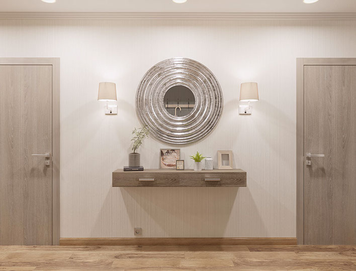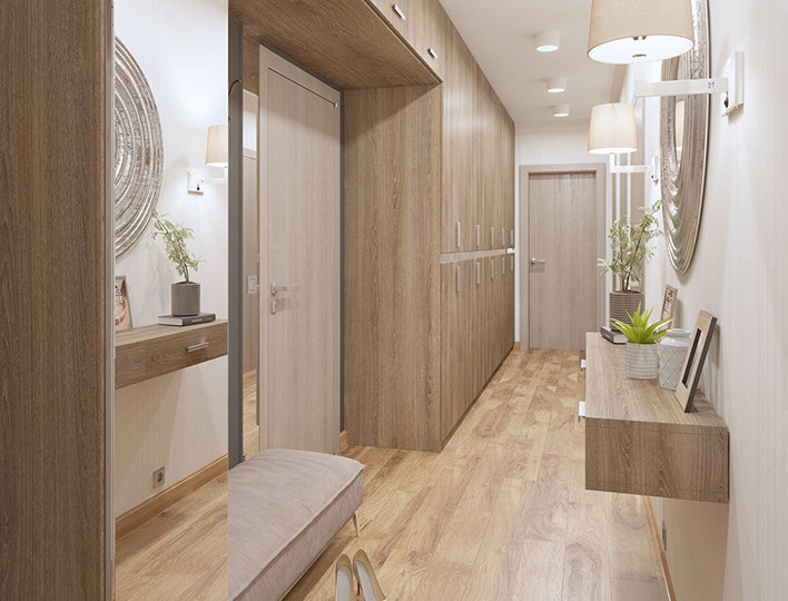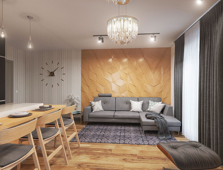 Tento projekt byl vytvořen pro rodinu se dvěma dětmi, preferující moderní a lakonické interiéry. Jedním z hlavních požadavků byla absence otevřených polic a dostatečný objem úložného prostoru. Základem návrhu byla kombinace dřevěné dýhy, šedé omítky, minimalistických papírových tapet, jednoduchého nábytku a studeného kovu, to vše v teplém osvětlení.
