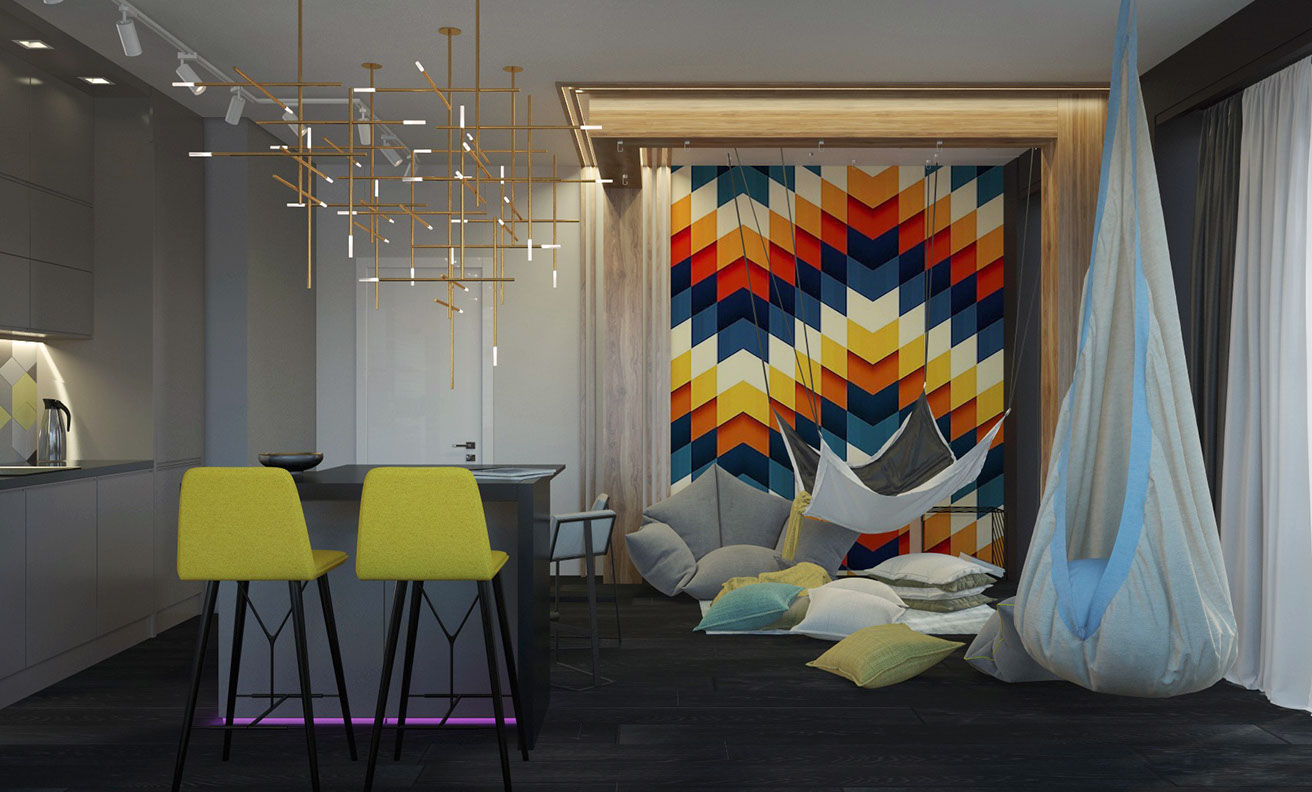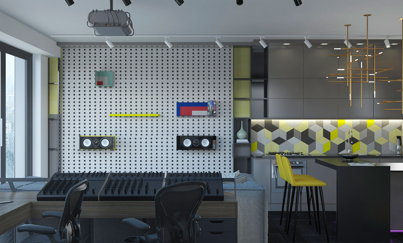 Projekt byl připraven pro úspěšného mladého muže, který miluje neobvyklá technologická řešení, pohodlný nábytek a pestré barvy. Zvláštním požadavkem klienta bylo vytvořit prostor tak, aby se ho dalo transformovat, a to nejen změnou umístění objektů, ale i spojením nových přístrojů, zavěšením nových lamp a nastavením osvětlení.