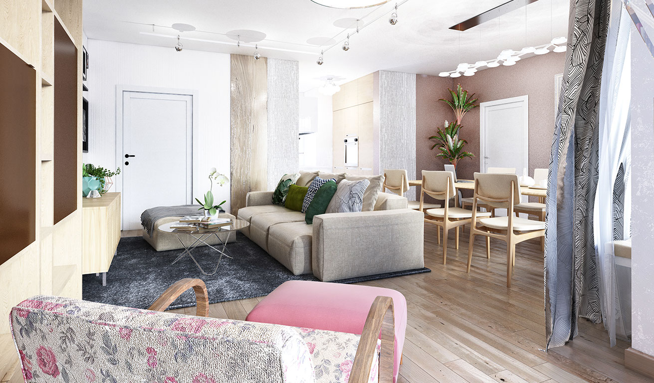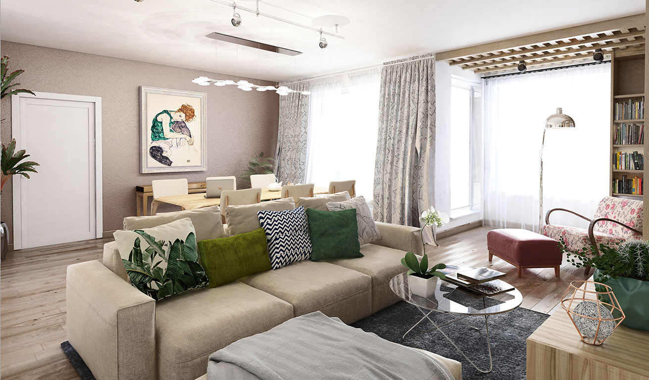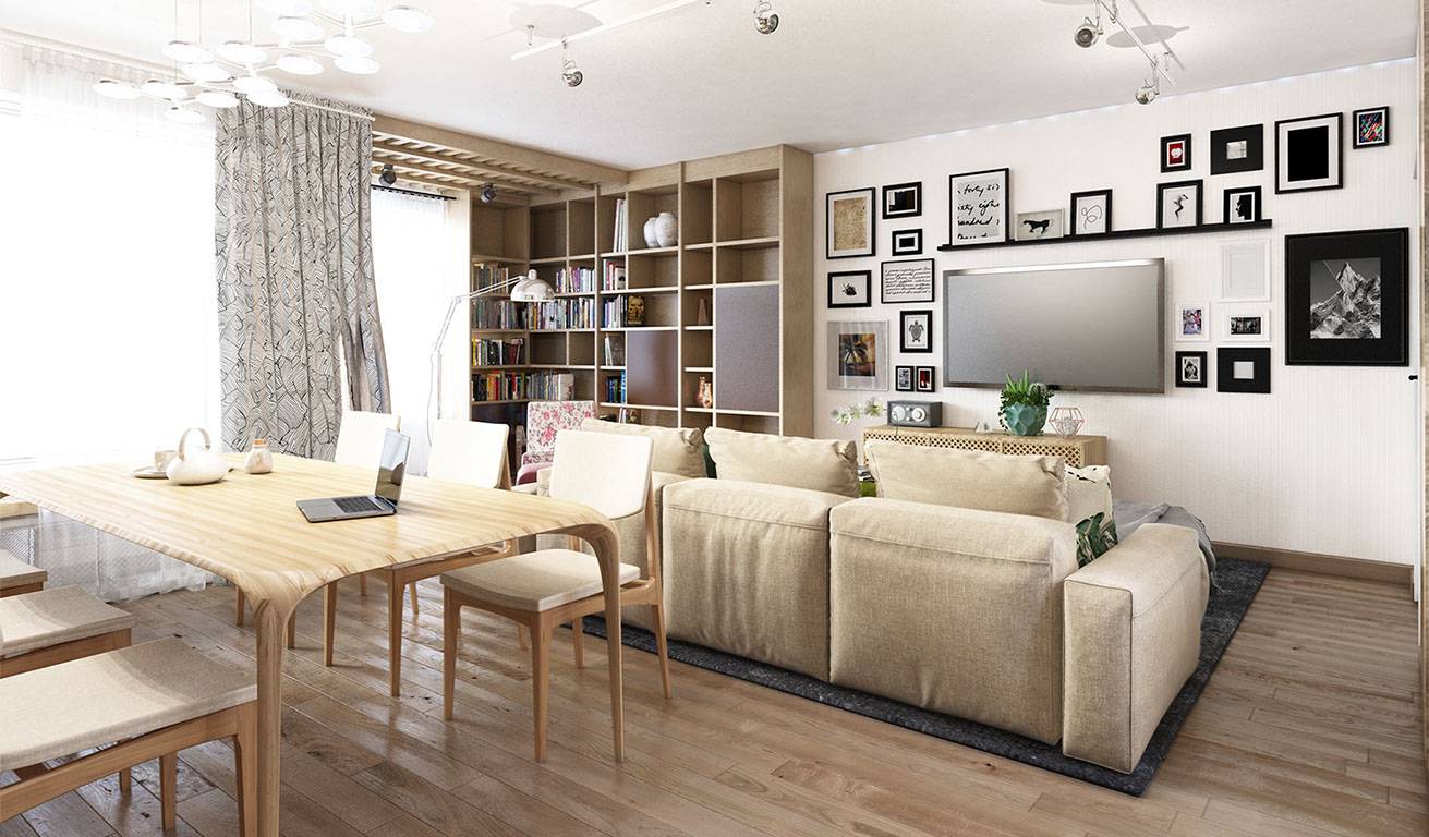 Данный дизайн создавался специально для молодой чешской пары. Одним из их главных пожеланий было суметь уместить в одно пространство раскладной диван, обеденный стол и книжную полку, при этом незабывая подобрать место для кресла бабушки главы семейства, а также картины, пренадлежавшей в студенчестве заказчице.