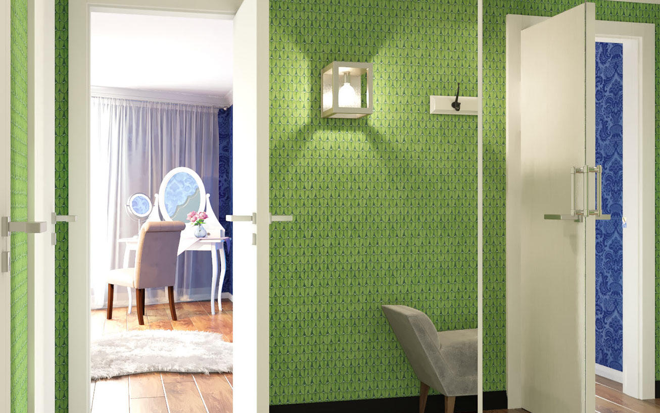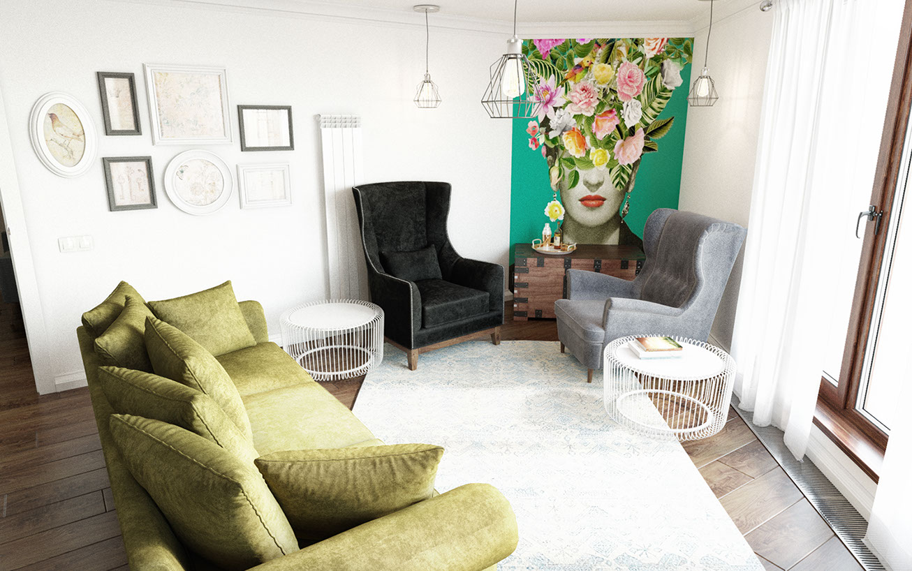 Tento projekt byl vytvořen pro mladý pár, který miluje eklektické motivy v designu, stejně jako odvážná řešení. Ložnice a chodba jsou vyzdobeny ručně vytištěnými tapetami, zatímco hala je navíc zdobena světlými fototapetami, mramorovými panely a deignovými lampami.