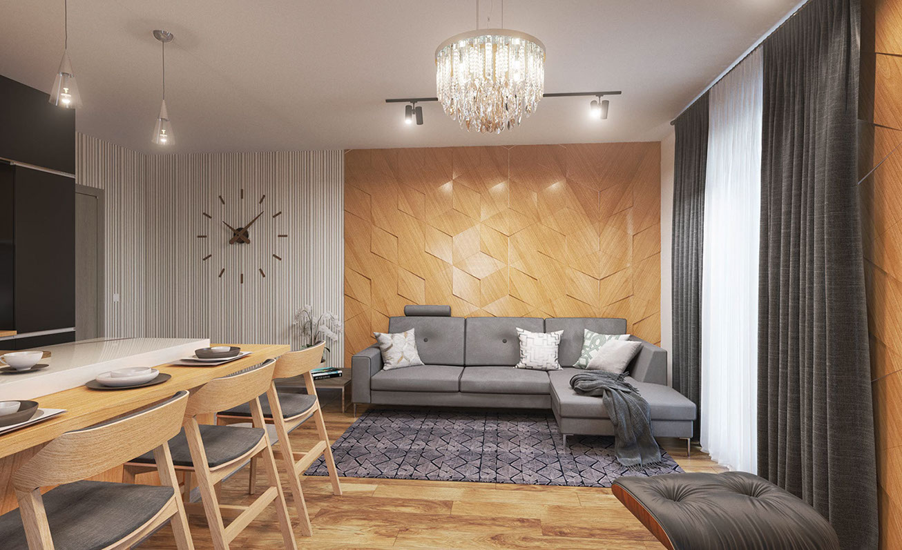 Основу дизайнерского решения в итоге составили сочетания деревянного шпона, серой штукатурки, минималистичных бумажных обоев, строгой мебели и холодного металла, и все это в теплом освещении.
