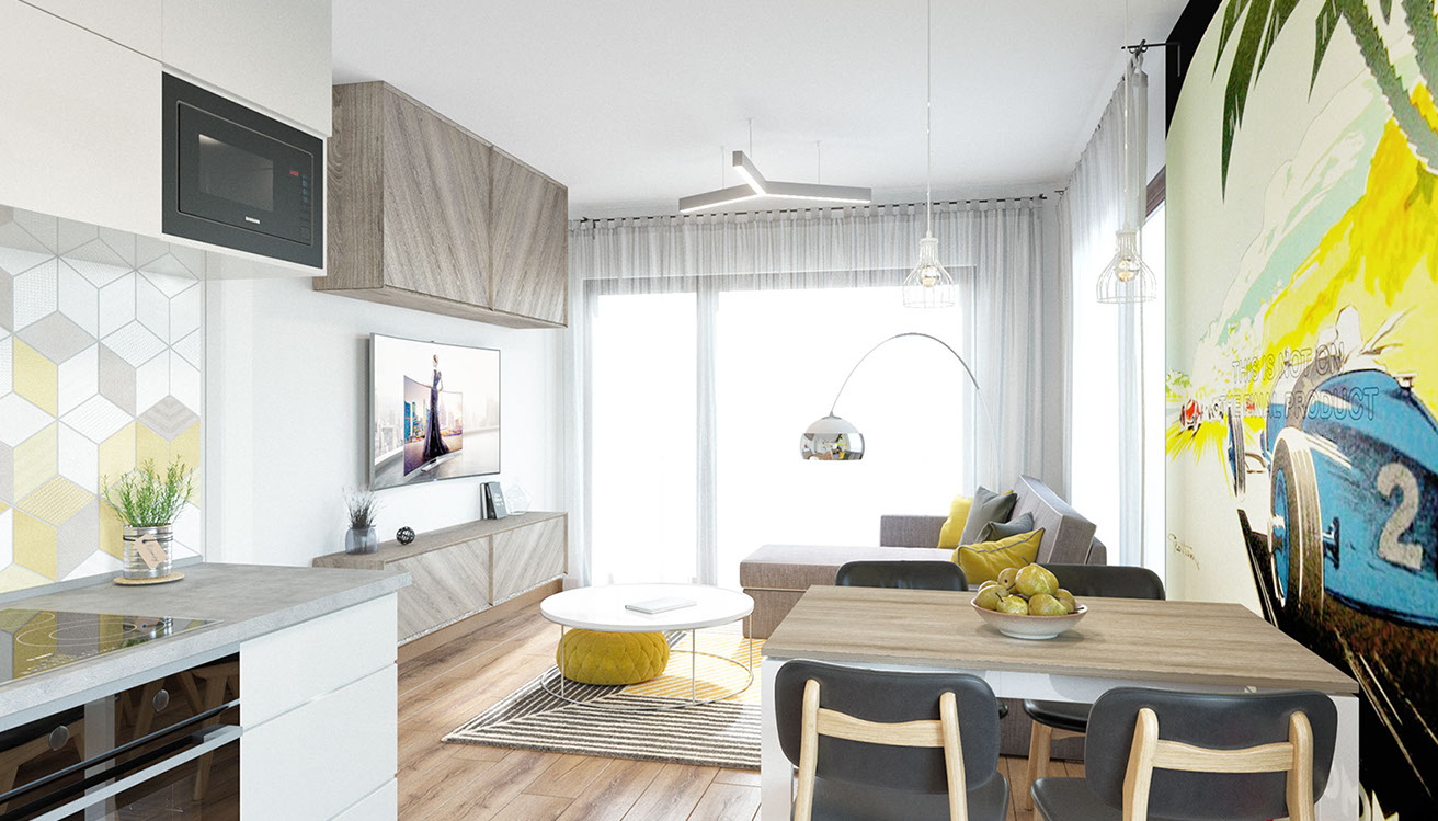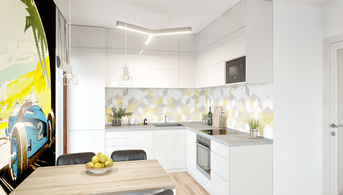 Дизайн проект этой двухкомнатной квартиры входит в число одного из самых любимых проектов нашей студии. Концепция данного интерьера была реализована для молодого парня, любящего яркие и светлые оттенки, а также лаконичные и современные решения в современных пространствах.